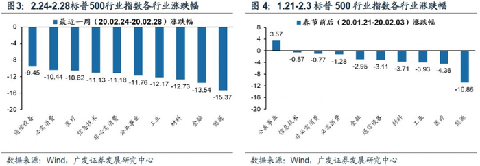作为对比,在中国疫情扩撒恐慌期(1.21-2.3),美股各行业同样地呈现出顺周期板块跌幅更大、科技和消费跌幅相对较小的特点。能源、工业、材料等顺周期行业跌幅最大,其中能源行业跌幅达到10.86%;信息技术、消费板块相对跌幅较小;公共事业行业为唯一上涨的一级行业,涨幅高达3.57%。