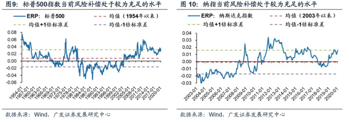 我们认为当前美股的真实估值并没有市场想象中那么高,考虑利率后的股权风险溢价补偿处于相对合理区间。股权风险溢价(即ERP,ERP=1/PE-Rf)可以衡量股价所包含的风险补偿是否足够。股权风险溢价越高说明风险补偿越高(大致可理解为对应的真实估值水平越低)。截至20年2月28日,标普500的ERP依然处于1954年来的均值+1倍标准差,处于历史区间中的较高值。代表美国成长股的纳斯达克指数的ERP也较高,截至20年2月28日纳斯达克指数的ERP依然处于2003年来的均值+1倍标准差。这说明美股风险补偿较为合理,对应的真实估值并没有市场想象中那么高。
