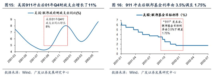 美国政府为了应对“911事件”,推出了宽松的货币政策和积极的财政政策。在“911事件”发生之后,美国政府为了应对“911事件”对美国经济的影响采取了许多应对措施,刺激经济。货币政策方面,美联储在“911事件”之后的9月17日,将联邦基金目标利率从3.5%下调至3%,降息50BP。从“911事件”发生到2001年12月11日,美联储总共降息4次,将联邦基金目标利率从3.5%下调至1.75%,降息175BP。财政政策方面,财政政策方面,美国政府明显增加了财政支出,在2001年第四季度,美国联邦政府财政开支同比增长8.0%,相对于2000年第四季度政府财政开支同比增长的0.1%,增加了7.9个百分点。