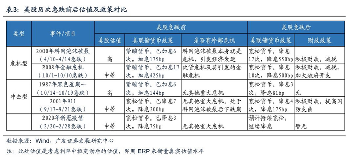 规律三:危机型急跌后实施宽松货币政策短期内难以见效,而冲击型急跌后实施宽松货币政策可以在较短时间内稳定市场。比如2000年科网泡沫和2008年金融危机,在危机爆发后美联储均实施了宽松的货币政策,但美股在短期内并无太多起色,仍然延续下跌趋势。而冲击型急跌后实施宽松货币政策可以在较短时间内迅速稳定市场,比如1987年黑色星期一次日美联储向银行系统注入流动性,市场立刻就企稳止跌。2001年911冲击后休市四天,美联储在开市第一周初就立刻降息,美股经过一周下跌后在第二周就企稳并连续反弹两个月。