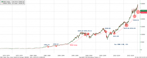 图表1:当没有经济衰退时,道琼斯指数往往会从850天的平均线反弹