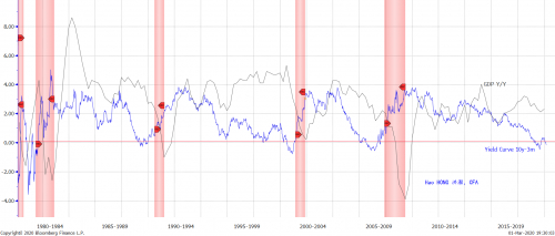 美国市场情绪和技术指标在此次暴跌后极度低迷,看跌/买入比率、垃圾债券息差、股指成份股超卖比例和历史下跌速度都表明了这一点。如果以史为鉴,未来一周里美国市场出现技术修复的概率非常大。然而,如果新冠病毒的蔓延比人们担心的更严重,全球经济因为过度的隔离措施而陷入衰退,在拯救生命的同时又不得不阻碍了经济的增长,那么经济危机就会随之而来。我们注意到,美国收益率曲线刚刚再次反转,这种反转往往会领先经济衰退最长可达18个月(图表2)。如是,美国股指将下跌一半甚至更多,将要出现的技术反弹将是短暂的,本质上是技术性的。有现代货币理论者讨论关于美联储将要进入负利率区间。然而如果当真如是,这将是一场真正的灾难——因为美联储是全球的央行,而美国国债是全球的避风港。美联储如果执行负利率政策,其后果和其它国家不可同日而语。