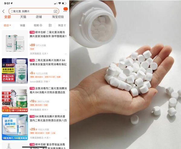 记者又上电商平台搜索了一下二氧化氯泡腾片,各种品牌的消毒泡腾片确实不少,大多是白色或淡黄色的圆形药丸状,如果在没有任何标识和说明的情况下,容易有误食的风险。