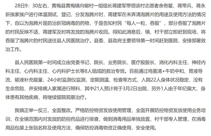 中国市场监管报记者从黄梅县人民政府官网了解到事情的详细经过,且目前22人经治疗已无大碍。