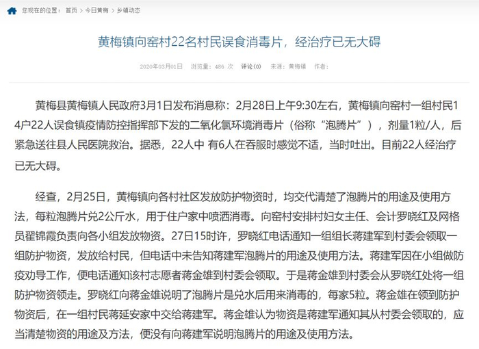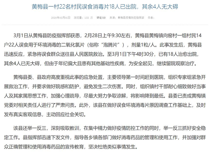 3月1日,湖北黄梅县22人误食消毒片的新闻登上热搜,引起网友广泛关注。针对此事,湖北黄梅县黄梅镇政府发布回应,详细讲述事件经过,主要原因是工作人员衔接不畅,最后经办人没有弄清楚消毒片的正确使用方法,导致村民误服。
