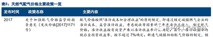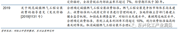 2017年发改委规定,按照“准许成本加合理收益”的原则制定城燃公司配气费,准许收益率为税后全投资收益率,按不超过7%确定。2018年,全国所有省份均出台了配气价格监审政策方案。2019年国家进一步要求合理确定城镇燃气工程安装收费标准,原则上成本利润率不得超过10%,取消城镇燃气工程安装不合理收费。