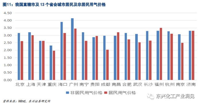 非居民用气价格较高,不利于市场公平竞争。通过比对四个直辖市以及13个省会城市的居民与非居民用气价格,我们不难发现绝大多数城市非居民用气价格要高于居民用气价格,出于追求利润的目的,城燃企业更愿意以较高的价格将天然气出售给非居民用户,极易导致居民用气供气不足现象的发生,不利于保障和改善民生。未来居民用气与非居民用气价格将趋于统一,真正实现居民与非居民用气价格的并轨,实现市场公平竞争。