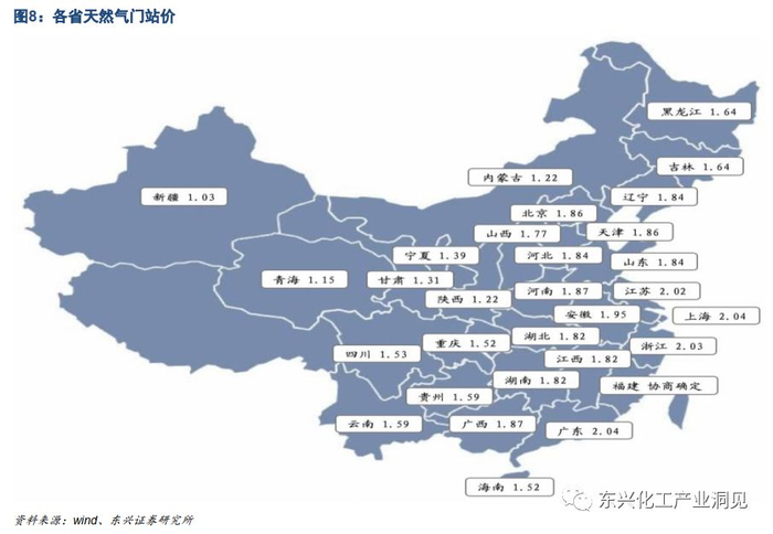 由于各省(直辖市、自治区)的天然气资源禀赋不同,与天然气气源的距离不同,运输的成本存在差异,因而各地的天然气门站价存在一定差异。总体上,各地的天然气门站价均位于2元/方左右,其中陕西、新疆等省份是气源地,因此门站价略低。