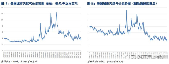 市场充分竞争,居民用气成本下降。在供应端充分竞争的市场环境下,下游用户可以自由选择最适合的生产商,价格扭曲被消除;而页岩气开采技术的成熟进一步降低了天然气开采成本;加之页岩气开发井喷,产能暴涨,在剔除通货膨胀因素后,美国天然气城市价总体上呈下降态势,居民用气成本逐步降低。