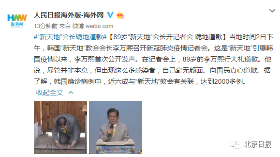 89岁新天地教会会长跪地道歉,韩两千多确诊病例与该教会有关