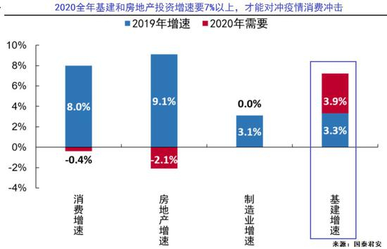 国泰君安认为,针对此次新冠疫情,假设疫情对2020年2月社零增速冲击为5个百分点,为了对冲消费的负贡献, 2020年全年固定资产投资增速至少需要5.9%。假设2020年制造业投资增速维持在3.1%增速不变,房地产投资增速为7%,则需要全年基建投资增速达到7.2%。
