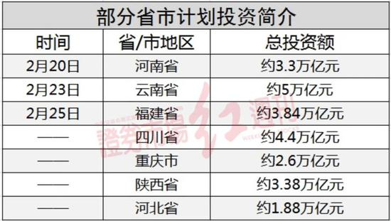 从各省市发布的重点项目清单来看,目前已有7省市推出未来几年25万亿重点项目。例如,河南、云南、福建三省在短短5天内先后提出3.3万亿、5万亿和3.84万亿的项目。