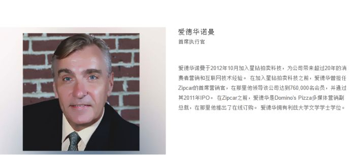 据官网介绍,爱德华诺曼(Edward Norman)于2012年10月加入星钻拍卖科技, 在加入星钻之前,是在zipcar做首席营销官(CMO),并带领公司2011年IPO。