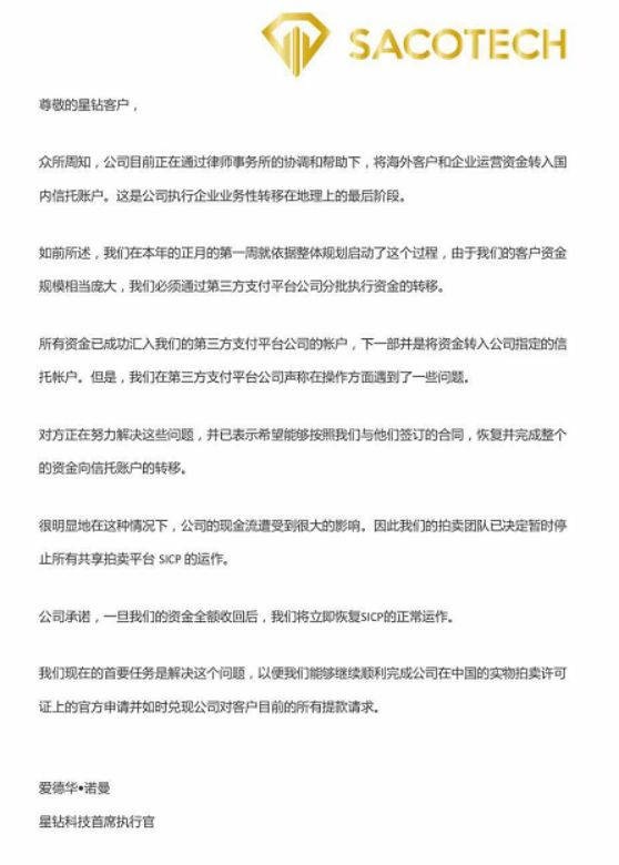 在这个公告中,星钻拍卖称,从2020年正月的第一周开始,着手将国外所有的资金转到中国的信托账户,由于资金庞大,需要通过第三方支付公司分批转移,但现在第三方支付公司声称遇到了问题,因此星钻的现金流遇到了问题,决定暂停平台动作。但公告中并未透露是哪家第三方支付公司。