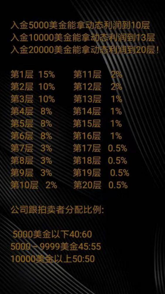 2,高级经纪人:本人5000美金;培养2组初级经纪人,净入金6000美金/组。