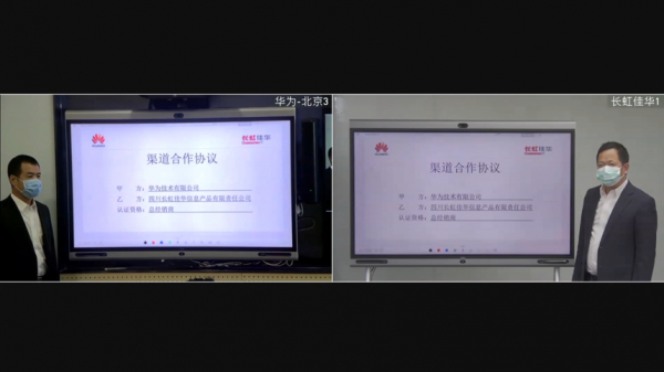 新华财经北京3月2日电 3月2日,华为和长虹佳华共同宣布,长虹佳华与华为企业业务达成中国区总经销商合作意向。依托于华为云WeLink平台和CloudLink Board协作智真,双方举办了形式新颖的线上云签约。四川长虹电子控股集团有限公司董事长赵勇,长虹佳华控股有限公司执行董事、总裁祝剑秋,华为公司董事、企业BG总裁彭中阳以及华为中国政企业务总裁蔡英华等嘉宾通过WeLink平台发表了致辞。在众多媒体的线上见证下,华为中国政企业务副总裁杨文池和长虹佳华高级副总裁包顺仓代表双方签约,双方达成合作意向。