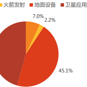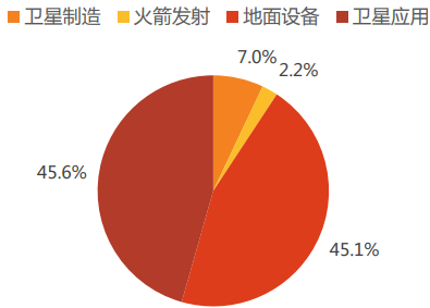 美国卫星工业协会(SIA)数据显示,2018年全球卫星行业总产值为2774亿元,其中卫星制造产值为195亿美元,卫星发射产值为62亿美元,卫星应用产值为1265亿美元,地面设备产值为1252亿美元。