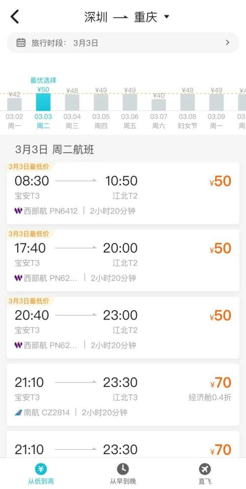 券商股记者查询了携程、去哪儿、飞猪等第三方订票软件,发现“白菜价”机票已经持续供应。以深圳飞重庆为例,3月2日至3月15日,深圳至重庆单程机票最低价格均在百元以下,其中3月3日价格在50元上下,折扣低至0.4折。