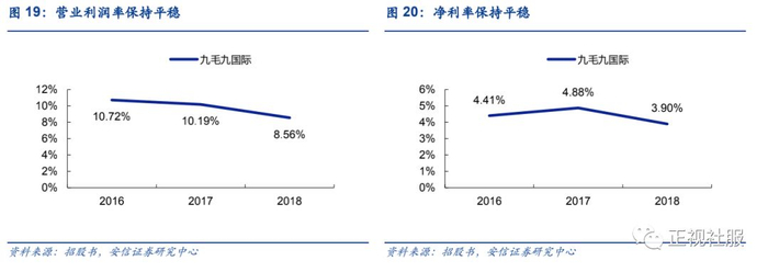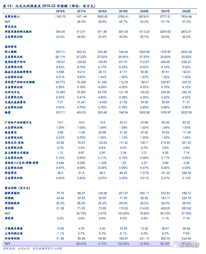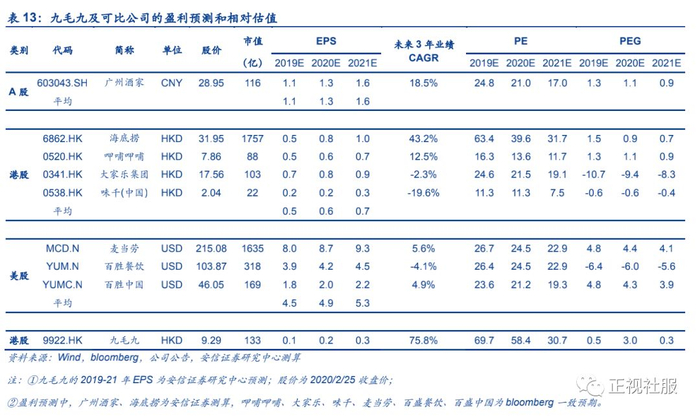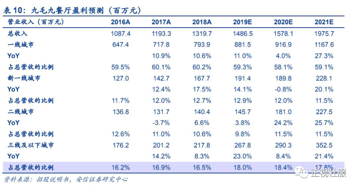 2)九毛九经营预测:预计九毛九餐厅19-21年营收复合增速14.4%,有望从2018年的147门店对应的13.2亿元营收(预计期间累计新开店60家,关店6家),增长至2021年201家门店的19.8亿营收。其中,一线城市是未来扩张的重点,对应19-21年复合增速达13.7%,新一线、二线和三线及以下城市基数较小,门店营收复合增速预计分别为10.8%/17.5%/17.4%。