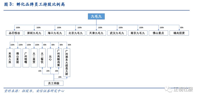新品牌员工持股比例高,调动工作积极性,助力品牌孵化。2015年起九毛九陆续孵化了太二、怂、广州两颗鸡蛋、那未大叔四大新品牌,均设置了较高的员工持股比例,其中太二为15%,怂、两颗鸡蛋、那未大叔均为20%。较高的员工持股比例,有助于带动员工积极性,在新品牌孵化的过程中,品牌经营好坏与员工自身利益高度挂钩,因此员工为努力品牌经营出谋划策,积极运营,有助于品牌的成功孵化。