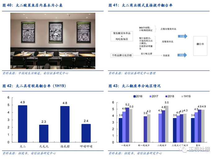 1)翻台率高:精简SKU+弱化社交,“快”商业模式推高翻台率。太二的翻台率自2016年以来不断提升,由2016年的3.6倍增至1H19的4.9倍,与同业公司相比,太二翻台率较高,主要因为聚焦酸菜鱼单品+定位纯吃饭场景,直接提高点餐出餐用餐效率:①以酸菜鱼为特色,少SKU提高点餐出餐效率:太二最大的竞争力是酸菜鱼单品,菜品SKU少而精。为保证产品品质和口味,餐厅贯彻“少即是多”的理念,店内主菜提供一种酸菜鱼,由小、中、大三个分量选择,并且口味和辣度固定,让专业团队决定菜品口味,只提供大概率的最优解给客户,不加辣不减辣不做外卖。酸菜鱼之外,店内只供应不多于23种的其他菜品,极为精简的SKU不仅简化顾客选择,并且降低后厨准备难度,提高点餐及出餐效率。②弱化社交,简化服务,提高用餐效率:太二定位纯吃饭场景,弱化用餐社交功能并简化产品外的其他服务。太二店面都开在大型购物中心,餐厅面积介于200-300平方米,大约有33张餐桌容纳110位顾客。来购物中心逛街的人2-4人居多,同时餐厅规定不接待四人以上就餐,弱化餐厅社交功能,让顾客能专心享用菜品,在保证顾客吃鱼体验的同时,也提高了顾客的用餐效率。为打造简单的纯吃饭场景,太二还取消了除产品以外的各种收费,同时将服务简化,倒水也要顾客自助。餐厅2015年就实现了微信闭环点餐,前后台完全打通,可实现通过手机扫码点单、厨房自动出单、自动上菜、扫码买单、发票等一系列流程,减少人工服务成本,提高餐厅服务效率。