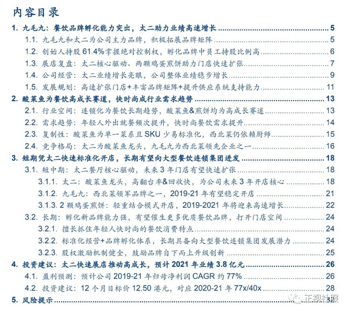 募集资金助推门店加速扩张,丰富品牌矩阵,太二为公司的主要扩张力量。扣除上市应付的包销佣金、费用及估计开支后,公司总共募集的资金净额为24.03亿港元。基于公司现有的标准化、易复制的业务模式,公司计划使用72%的募集资金(即17.31亿港元)用于门店的快速扩张:①太二:迎合酸菜鱼市场的增长趋势,公司计划使用48%的募集资金(即11.54亿港元)于2020/21年开设80/100家太二餐厅,其中一线城市每年的新开门店数计划6-10间以提升品牌影响力,新一线及省会城市等30余个城市每年新开1-2间以进行全国化布局;②九毛九:基于巨大规模的西北菜市场,公司计划使用9%的募集资金(即2.16亿港元)于2020/21年开设18/20家九毛九餐厅,新门店主要开设于华南地区,采用最新的业务模式,即精简菜品供应品种(剔除低销量、制备工艺复杂的菜品),提高标准化制作水平;③其他品牌:为扩充公司的品牌矩阵,公司计划使用10%的募集资金(即2.40亿港元)于2020/21年开设24/36家其他品牌餐厅,包括2颗鸡蛋煎饼(自营)、怂及那未大叔是大厨,主要开设于华南地区。