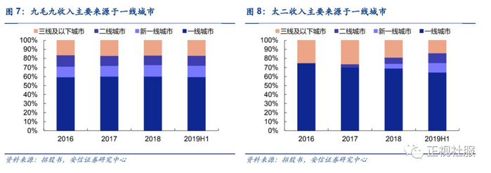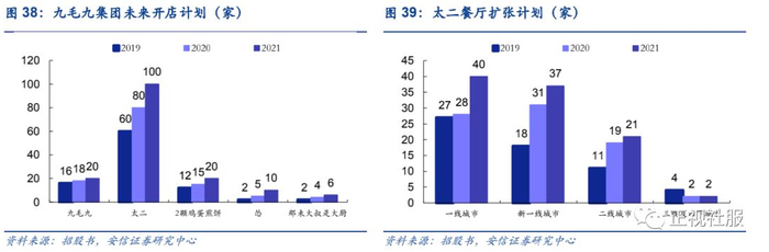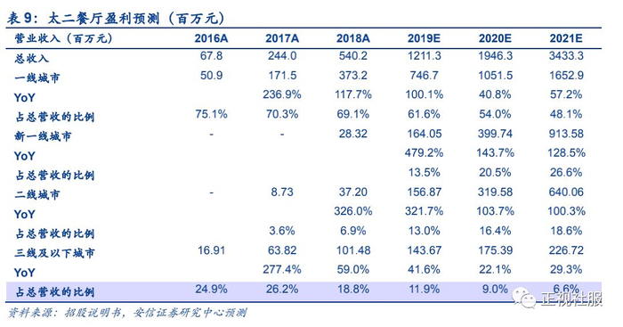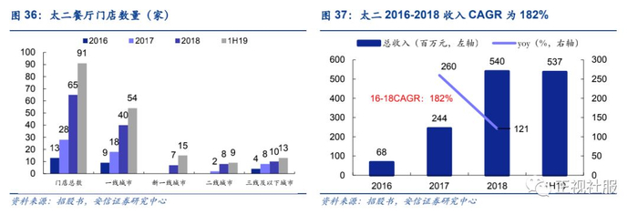 公司顺应酸菜鱼餐厅高速发展态势,2019-2021年展店将以太二酸菜鱼为主,一线及新一线为开店重心。①太二未来开店:2016-1H19公司自营门店数由142家新增120家至262家,其中太二酸菜鱼由13家新增78家至91家,新增120家餐厅中太二酸菜鱼占比75%,使得太二酸菜鱼占公司营业收入的比重由2016年的5.8%逐年提升至1H19的43.4%。根据招股书披露,公司在2019-2021年的开店仍将以太二酸菜鱼为核心,2019-2021计划分别新增门店60/80/100家,对应占公司每年的计划开店数65%/66%/64%。②新开店分布:截至1H19,太二59.3%的门店位于一线城市(54家),26.4%的门店位于新一线和二线城市(24家),14.3%的门店位于三线及以下城市(13家),呈倒金字塔型结构。因太二酸菜鱼餐厅尚处于初步扩张阶段,一线城市尚未开拓完全,从公司未来扩张计划来看,2019-2021年计划在一线/新一线/二线/三线及以下城市各新开95/86/51/8家太二餐厅,未来扩张的重点将放在一线及新一线城市。