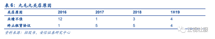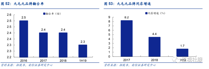 翻台率稳定,同店保持增长但增速下滑。九毛九品牌的翻台率1H19为2.3倍,较2016年的2.5倍有所下滑但基本保持稳定,1H19同店增长1.7%,增速较2017/2018年的8.2%/4.4%有所下滑,因此九毛九品牌的收入增长应主要关注外延以及关店调整情况。