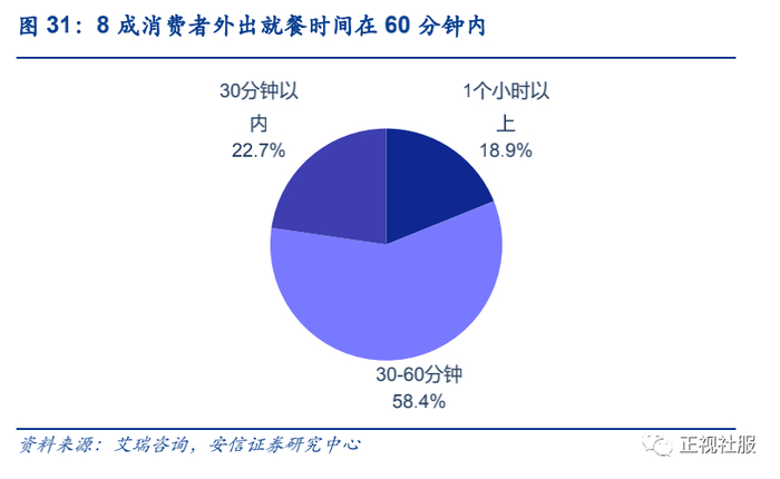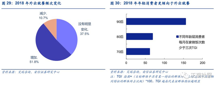 外出就餐频次增长,年轻顾客为主要消费力,就餐时间较短,快时尚餐饮需求持续提升。随着生活节奏的加快,对生活的品质要求的提升,消费者外出就餐的频次越来越多,年轻消费者这一特点更为突出,根据艾瑞咨询2018年发布的《中国新餐饮消费行为趋势研究报告》显示,2018年,51.8%的消费者外出就餐频次有所增加,90后相较70/80后外出就餐偏好更强,是餐饮市场的主要消费力。8成以上消费者外出就餐时间在60分钟内,其中22.7%控制在30分钟内,58.4%的消费者用餐时间在30-60分钟内,这一消费习惯,助推了快时尚餐饮的发展。标准化、规模化的餐厅在备餐时间上更具效率,为迎合当下年轻人消费个性化的要求,快时尚餐厅的餐厅布置、营销方式更为新颖。如太二酸菜鱼定位纯吃饭场景,弱化用餐社交功能并简化产品外的其他服务,较少的SKU选择,帮助备菜标准化,提高餐厅服务效率,缩短顾客用餐时间。太二采用的反向营销符合90后个性化趋势,容易引起消费者关注。餐厅通过店内黑白漫画装修风格、“太二太傻店老板”的品牌故事、“对暗号”等个性化方式传播品牌文化,借助在“好口味”的背后支撑下,引发口碑效应,提高餐厅知名度并带来源源不断的客流。
