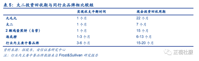 3)投资回收期短:1个月收支平衡,7个月现金投资回收,投资回收能力行业领先。单店回收期方面,太二餐厅一般运营满一个月实现收支平衡,7个月现金投资回收;海底捞一般1-3个月盈亏平衡,6-13个月现金投资回收。餐饮行业内主要的中餐品牌通常3-6个月实现盈亏平衡,15-20个月实现现金投资回收,太二的投资回收能力处于行业较高水平。太二酸菜鱼单店回收期短原因为:①餐厅面积较小,一般为200-300平方米,单店投资成本低,根据招股书公布的扩张计划中,平均每家太二餐厅的投资成本约为250万元。②餐厅目前尚处于扩张初级阶段,一线城市还有很大扩展空间,口味+营销双重作用下客流量大,翻台率数据表现优异。