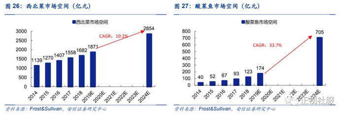 ■酸菜鱼市场凭借标准化,易复制的优势,为中餐易扩张的优质赛道之一。①酸菜鱼餐厅以酸菜鱼为主菜,无需提供过多菜品使得SKU少,且酸菜鱼食材、制作、口味均易标准化,对厨师依赖程度小,相对正餐而言更复制和品牌化扩张。②根据Frost&Sullivan数据,2018年全国酸菜鱼市场规模123亿元,预计2018-2024年CAGR达33.7%并至2024年705亿元。因此,酸菜鱼餐饮同为餐饮连锁中优质赛道之一。