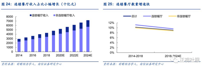 领先企业、连锁餐厅具有更强的市场竞争力,品牌化、连锁化成为餐饮行业趋势。餐饮市场规模大,以独立运营的餐厅为主导,但由于连锁餐厅具有强大的品牌曝光度,更大的业务规模和客户群,以及中央厨房在食品供应和运营标准化方面的优势,保证了产品质量及餐厅翻台率,迎合了消费者期望并提升餐厅经营效率,因此品牌化、连锁化逐渐成为趋势。2014-2018年,连锁餐厅于整个餐饮市场的收入占比由18.8%升至19.5%,预计2024年,连锁餐厅收入占比为20.1%,连锁餐厅市场占比小幅增长。受益于整体餐饮市场的高速增长,连锁餐厅收入将继续保持增长。消费者对品牌声誉、食品安全、餐厅服务等各方面的重视程度愈来愈强,预计连锁餐厅数量的增长将超过非连锁餐厅。拥有完善供应链体系、标准化流程及资本支持的领先企业具有更强的市场竞争优势。根据公司招股书,2018年前100大企业合计实现收入2410亿元,较2017年增长12.2%,超过行业整体增长率。