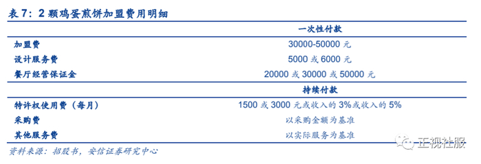 3)2颗鸡蛋煎饼:是公司2017年推出的快餐品牌,进军小吃市场。该品牌于2018年开放加盟,以雇员加盟商模式实现快速扩张,目前在自营和加盟两种模式下经营。2颗鸡蛋煎饼以中式煎饼为主打产品,产品定位“健康/方便/快捷”,一般不设堂食,人均消费为20-30元。