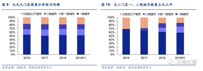 太二门店扩张重点在一线&新一线城市,九毛九门店分布更为均匀。一线城市为太二的重心,扩张速度快,2016年一线城市门店数为9家,截至2019年H1一线城市门店数达54家,占比达59%。新一线城市门店数量快速增长,2018年7家,2019H1达到15家,占比16%。2019年H1,一线及新一线城市门店贡献收入4.04亿元收入,占比75.2%。九毛九扩张速度平稳,2016年门店数为128家,2019年H1门店数达144家,增速平稳。门店主要分布于一线城市,但在二、三线城市数量分布较太二更为均衡。截至2019年上半年,一线城市门店数75家,占比52%,其他城市层级占比均在13-18%范围内。