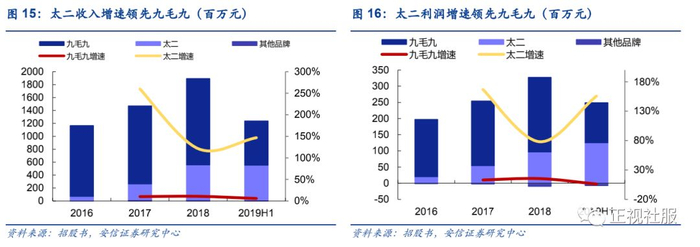 ■成长性:短中期在IPO募资下以太二等餐厅标准化复制扩张,长期有望进军大型餐饮连锁集团。1)短中期门店扩张:①太二:系酸菜鱼餐厅市场龙头,市占率行业第一(据招股书)。太二凭借翻台率高(1H19为4.9台)、投资回收期短(1个月收支平衡、7个月现金投资回收)、模式新(个性化反向营销,强化传播效应)使得标准化复制能力强,在2019-2021年期间将以一线和新一线开店为核心,计划分别新增太二餐厅60/80/100家,对应公司当年新开店总数的65%/66%/64%。②九毛九:西北菜领军品牌之一,为公司最早创立的品牌,1H19门店数149家,2019-2021年计划新增16/18/20家。③2颗鸡蛋煎饼:2017年推出,以自营+加盟轻重结合模式展店,19年上半年自营/加盟各20/35家,各贡献总收入0.8%/0.4%,计划2021年自营/加盟门店增至62/300家。2)中长期进军餐饮连锁集团:公司标准化扩张和经营经验丰富,5个品牌并行运作,7个职能部门支持品牌运营,形成较成熟的品牌孵化体系;各品牌由独立团队负责,股权激励机制健全,长期看有望向大型餐饮连锁集团进军。