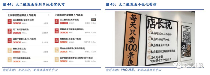 2)模式新:口味为核心壁垒,同时进行个性化反向营销,强化传播效应。①口味是太二的核心壁垒:酸菜鱼是太二的核心产品,为打造优质酸菜鱼,公司组建专业研发团队,对比各种鱼类,挑选出最适合做酸菜的加洲鲈鱼。因鱼肉口感差异难以形成壁垒,太二将重点放在酸菜上,以“酸菜比鱼好吃”为目标,坚持自己采用传统方法腌制酸菜,模仿重庆地窖环境,并选用天然泉水来制作盐水,使酸菜口感脆爽,酸味达标。太二餐厅的酸菜鱼受到多地食客认可,入选大众点评多地酸菜鱼排行榜top1,口味成为太二餐厅的核心壁垒。②以口味为支撑,反向营销强化传播效应:市场上的餐厅通常都在想办法迎合顾客,讨好顾客,而太二的品牌文化却在“强势”的制定自己的规矩,反向营销进入顾客心智,通过店内店外的标语、“规矩”,不仅解释了自己在服务和菜品选择上的“招待不周”,还反向引发传播效应。反向营销优点在于容易引起消费者关注,且符合90后个性化趋势,但必须有核心竞争力作为支撑效果才能持续。餐厅通过店内黑白漫画装修风格、“太二太傻店老板”的品牌故事、“对暗号”等个性化方式传播品牌文化,借助在“好口味”的背后支撑下,引发口碑效应,提高餐厅知名度并带来源源不断的客流。