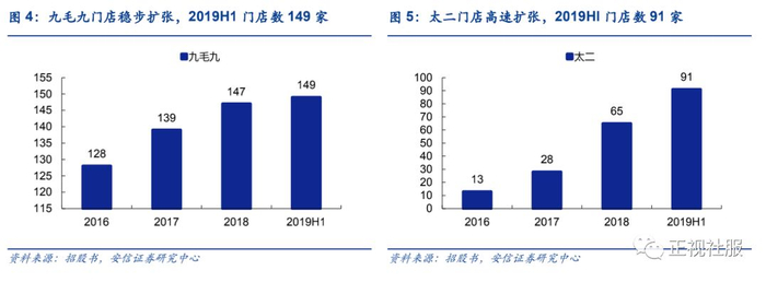 门店加速扩张,太二、两颗鸡蛋煎饼为主要扩张力量。2015年公司推出太二,2017年孵化两颗鸡蛋煎饼并在2018年开放加盟,门店扩张进入加速期,2016年太二门店数量仅为13家,截至2019年6月30日,门店数量达91家,远高于九毛九门店扩张速度。两颗煎蛋煎饼自2018年下半年开放加盟以来,门店扩张速度加快,自2017年的8家扩张至2019H1的55家。