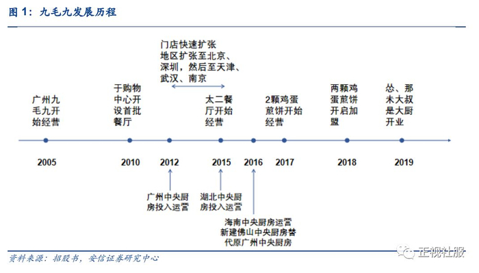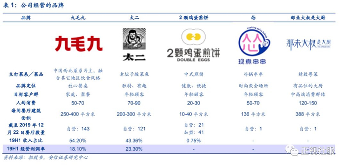 公司成立于2005年,在中国拥有逾23年餐饮经营历史,是一家以连锁经营为核心的中式快时尚餐饮集团。作为中国中餐厅品牌龙头,2017、2018年被连续评为“中国餐饮品牌力百强品牌”。目前管理、经营着五个自创品牌,包括九毛九、太二、2颗鸡蛋煎饼、怂以及那未大叔是大厨,店铺版图覆盖了华东、华南、华中、华北等区域。截至2019年12月22日,公司经营287间餐厅及管理41间加盟餐厅,覆盖中国的31个城市,遍及11个省份及4个直辖市。除2颗鸡蛋煎饼开放加盟外,其他品牌均为直营。其中九毛九和太二是公司主要收入来源,2019H1九毛九、太二为公司贡献98.7%的营收。