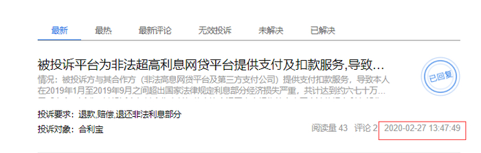 截至发稿前,仍有新的投诉显示“合利宝为非法网贷平台提供支付通道”。