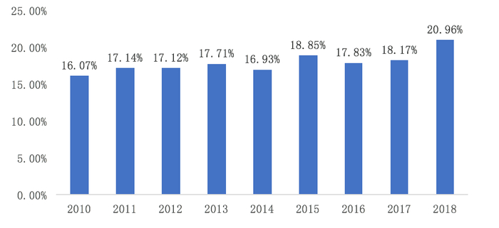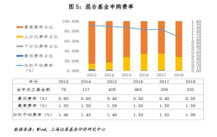 混合基金申购费率方面,随着最低申购费率的不断下调,2013年至2018年混合基金的加权平均申购费率水平呈下降趋势,由1.46%下降至1.09%。然而,从占比看,高申购费率一直占比都超过95%(详见图5)。