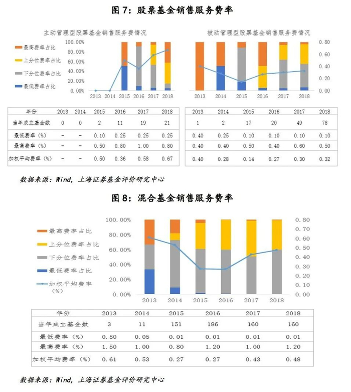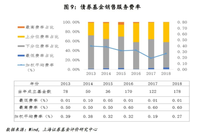 综上,自2013年允许各类基金全面采用销售服务费以来,股票基金、混合基金的加权平均销售服务费呈逐年上涨趋势,债券基金、货币市场基金的加权平均销售服务费呈下降趋势。