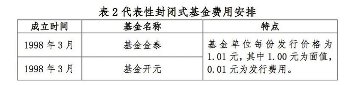 1997年11月14日,国务院证券委员会发布《证券投资基金管理暂行办法》(以下简称《暂行办法》),标志着我国公募基金业正式起航。《暂行办法》未对基金销售或者发行相关费用进行规定,仅在基金持有人义务条款规定基金持有人应当缴纳基金认购款项及规定的费用[12];同期发布的《基金契约样本》规定了基金单位发行价格和发行费用,并规定如是开放式基金,则需订明申购和赎回费用[13]。该阶段代表基金如表2所示。后续的封闭式基金基本沿用了基金金泰和基金开元的发行费用设置安排。