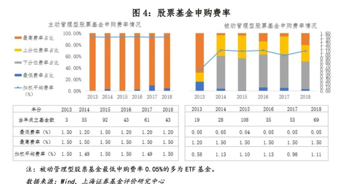 [1]不同认购申购金额适用不同认申购费率,不同基金持有期限适用不同赎回费率。为准确反映基金销售费用水平,本报告中认购费、申购费、赎回费均为当年新成立基金最高档费率的加权平均费率,参照基金年末管理规模加权平均计算,数据来源Wind和上海证券基金评价研究中心。