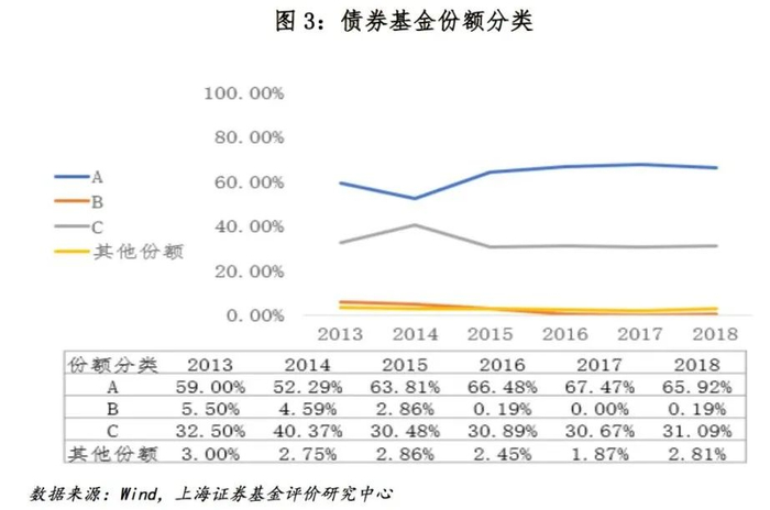 债券基金方面,2015后年A类份额占比有所上升、C类份额占比总体较为平稳,A类份额占比处于63%-67%,C类份额占比稳定于30%-31%。(详见图3)。