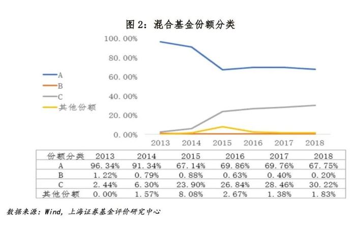 混合基金方面,2013年后混合基金A类份额占比下降明显,从2013年的96.34%降至2015年的67.14%后保持平稳,相应的C类份额占比从2013年的2.44%上升至2018年的30.22%(详见图2)。