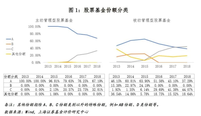股票基金方面,2014年以前主动管理型股票基金均采用A类份额,2015年开始出现C类份额且占比逐年上涨,2018年升至32.81%,B类份额占比极低;被动管理型股票基金A类份额占比自2015年后开始逐渐下降,2018年降至37.29%,相应的C类份额从2015年的6.14%,上升至2018年的44.07%(详见图1)。