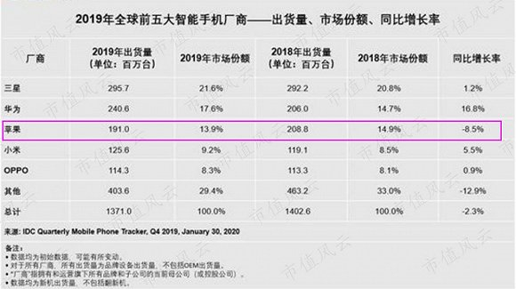 根据权威机构IDC的信息,2019年是全球智能手机出货量下降的第三个年头。苹果被华为反超,位居第三,市场占有率仅为13.9%,比上年下降了8.5个百分点。