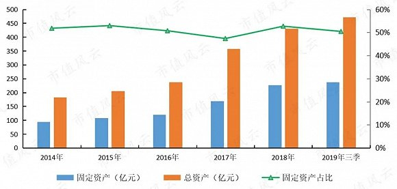 2017年末,公司的固定资产就比上市时增加了一倍。至2019年三季末,固定资产期末余额高达238亿元。