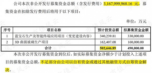 在2015年IPO募资15亿元建设触控功能玻璃面板之后,紧接着就在2016年搞起了定向增发方式,募资31亿元(不含发行费用),投建蓝宝石项目和3D曲面玻璃项目。