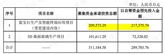 蓝宝石项目总投资近40亿元,使用募集资金21亿元。实际上,在“印股票”之前,该项目已经完成了一半,募资的钱全部用于置换预先投入的资金。